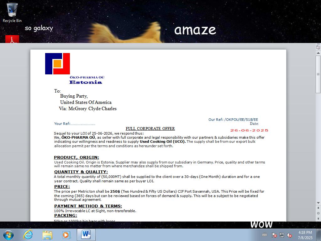 2025-07-08 16:17:51,015 [analyzer] DEBUG: Starting analyzer from: C:\tmpzepe2z 2025-07-08 16:17:51,030 [analyzer] DEBUG: Pipe server name: \??\PIPE\dpXNTPIsNXVUNXJxnIaRNKQYwo 2025-07-08 16:17:51,030 [analyzer] DEBUG: Log pipe server name: \??\PIPE\rCPndVQUmWFKPOUfWGqohdSqIjDH 2025-07-08 16:17:51,500 [analyzer] DEBUG: Started auxiliary module Curtain 2025-07-08 16:17:51,500 [analyzer] DEBUG: Started auxiliary module DbgView 2025-07-08 16:17:52,125 [analyzer] DEBUG: Started auxiliary module Disguise 2025-07-08 16:17:52,342 [analyzer] DEBUG: Loaded monitor into process with pid 504 2025-07-08 16:17:52,342 [analyzer] DEBUG: Started auxiliary module DumpTLSMasterSecrets 2025-07-08 16:17:52,342 [analyzer] DEBUG: Started auxiliary module Human 2025-07-08 16:17:52,342 [analyzer] DEBUG: Started auxiliary module InstallCertificate 2025-07-08 16:17:52,358 [analyzer] DEBUG: Started auxiliary module Reboot 2025-07-08 16:17:52,421 [analyzer] DEBUG: Started auxiliary module RecentFiles 2025-07-08 16:17:52,421 [analyzer] DEBUG: Started auxiliary module Screenshots 2025-07-08 16:17:52,437 [analyzer] DEBUG: Started auxiliary module Sysmon 2025-07-08 16:17:52,437 [analyzer] DEBUG: Started auxiliary module LoadZer0m0n 2025-07-08 16:17:52,578 [lib.api.process] INFO: Successfully executed process from path 'C:\\Program Files\\Microsoft Office\\Office14\\WINWORD.EXE' with arguments [u'C:\\Users\\ADMINI~1\\AppData\\Local\\Temp\\FCO-Clyde[2).docx'] and pid 2524 2025-07-08 16:17:52,578 [analyzer] INFO: Enabled timeout enforce, running for the full timeout. 2025-07-08 16:17:52,703 [analyzer] DEBUG: Loaded monitor into process with pid 2524 2025-07-08 16:17:56,312 [analyzer] INFO: Added new file to list with pid 2524 and path C:\Users\Administrator\AppData\Roaming\Microsoft\Office\MSO1033.acl 2025-07-08 16:17:57,858 [analyzer] INFO: Added new file to list with pid 2524 and path C:\Users\Administrator\AppData\Local\Temp\~$O-Clyde[2).docx 2025-07-08 16:17:58,562 [analyzer] INFO: Added new file to list with pid 2524 and path C:\Users\Administrator\AppData\Local\Microsoft\Windows\Temporary Internet Files\Content.Word\~WRS{5661A746-25D2-41D3-AE63-C015FDA3F806}.tmp 2025-07-08 16:17:59,125 [analyzer] INFO: Added new file to list with pid 2524 and path C:\Users\Administrator\AppData\Local\Microsoft\Windows\Temporary Internet Files\Content.MSO\CE442617.png 2025-07-08 16:18:00,342 [analyzer] INFO: Added new file to list with pid 2524 and path C:\Users\Administrator\AppData\Roaming\Microsoft\Document Building Blocks\1033\14\Built-In Building Blocks.dotx 2025-07-08 15:20:57,302 [analyzer] INFO: Added new file to list with pid 2524 and path C:\Users\Administrator\AppData\Roaming\Microsoft\UProof\CUSTOM.DIC 2025-07-08 15:22:40,256 [analyzer] INFO: Analysis timeout hit, terminating analysis. 2025-07-08 15:22:40,895 [analyzer] INFO: Terminating remaining processes before shutdown. 2025-07-08 15:22:40,895 [lib.api.process] INFO: Successfully terminated process with pid 2524. 2025-07-08 15:22:40,895 [analyzer] INFO: Error dumping file from path "c:\users\administrator\appdata\local\microsoft\windows\temporary internet files\content.mso\ce442617.png": [Errno 13] Permission denied: u'c:\\users\\administrator\\appdata\\local\\microsoft\\windows\\temporary internet files\\content.mso\\ce442617.png' 2025-07-08 15:22:41,006 [analyzer] INFO: Analysis completed.